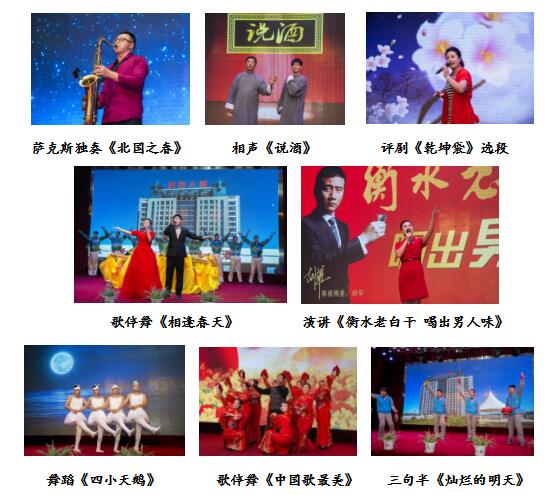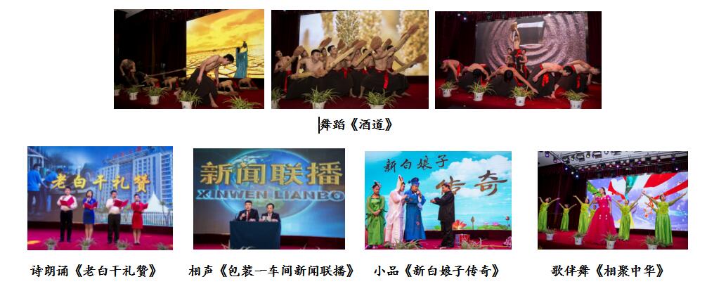 公司舞蹈隊(duì)帶來的舞蹈《酒道》,以逼真的表演將老白干酒文化呈現(xiàn)給觀眾,更把我們老白干精湛的釀酒技藝用肢體語(yǔ)言演繹的惟妙惟肖。詩(shī)朗誦《老白干禮贊》,高度贊揚(yáng)了衡水老白干建廠七十周年,一代代老白干人一路走來披荊斬棘,繼承傳統(tǒng)、開拓創(chuàng)新,譜寫成老白干最響亮的贊歌。營(yíng)銷公司崔艷芳、劉康康帶來的小品《新白娘子傳奇》,搞笑滑稽的動(dòng)作,奪人眼球,令觀眾拍手叫好。包裝一車間袁文興、貢愛華帶來的相聲《包裝一車間新聞聯(lián)播》,以幽默的語(yǔ)言,夸張的表情,使現(xiàn)場(chǎng)氣氛異?;钴S。最后,技術(shù)中心皮寒玉帶來歌伴舞《相聚中華》,聯(lián)歡會(huì)在最強(qiáng)音的旋律中圓滿結(jié)束。