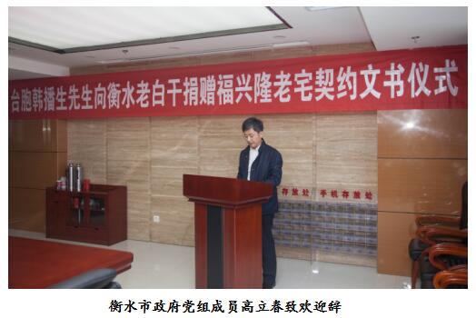 首先,由衡水市政府黨組成員高立春致歡迎辭:韓家先輩遠赴臺灣,對衡水一片癡心縈系了70余年,傳承了祖孫三代,今天三位親臨衡水,在寒冷的冬天為衡水及衡水老白干帶來了涓涓暖流。今天在這里隆重舉行福興隆老宅契約文書捐贈儀式,我們真誠感謝韓播生先生一行帶來彌足珍貴的歷史資料,既是對衡水老白干歷史沿革的挖掘,又是衡、臺文化交流的一筆重彩,必將有助于推動衡、臺文化的交流和發(fā)展,讓我們對韓先生一行表示敬意,讓我們共同祝愿衡水老白干的明天更加美好!
